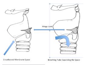 Cricothyroidotomy is an emergency procedure used by doctors and paramedics to provide oxygen to critically unwell patients when it cannot be provided any other way. Creating a hole in the front of the neck and placing a tube through it does this. This tube passes through skin and then through a narrow space called the cricothyroid membrane before entering the normal airway tube (trachea). The tube that is currently recommended for this is 8.2 mm thick on the outside. This thickness is considered important to let oxygen and other gases flow freely inwards and outwards. The membrane was previously thought to be about 10 mm high and would permit passage of the slightly smaller tube. However, recent research done by doctors, including ourselves using existing neck scans suggests that the membrane may be smaller than expected in a significant number of patients and that smaller tubes maybe required. We have reason to believe and wish to investigate whether the membrane space is expandable i.e. can move apart while the tube is passing through it. We believe this is the case because of a hinge type joint at the junction of the two cartilages on either side of the space where they join together at the back of the upper airway tube (Figure1).