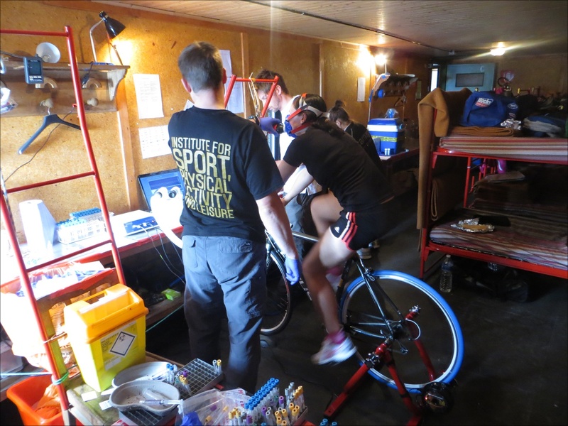 During September 2013 we embarked on a study to compare the physiological challenges of these different environments. A group of military medics volunteered as subjects and underwent thorough evaluation at Leeds Metropolitan University. The same equipment for measuring exercise performance was then used at 3370m at the Torino hut in Italy, in the normobaric hypoxic chamber in Leeds (FiO2 around 14%) and at the barometric pressure of the hut (560 mmHg) in the chamber at RAF Henlow.